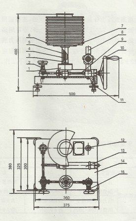 校驗(yàn)泵和活塞部分安裝在同一底座(14)上借導(dǎo)管(9)相連,中間裝有針形閥(2 )。整個(gè)壓力計(jì)由四個(gè)水平調(diào)節(jié)螺絲(11)支撐,并借以裝于底座上的水平泡(12)用以較準(zhǔn)水平位置。